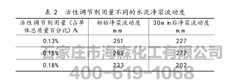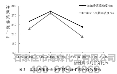 聚羧酸减水剂的水泥分散性能的。调节的活性调节剂用量分别为:0.13%;0.15%;0.18%。实验结果如表2和图2。