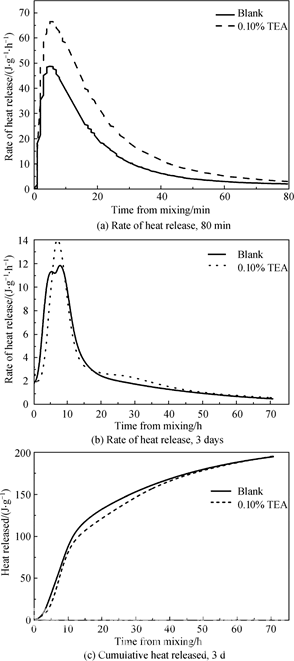 1) 0.10%TEA 增高了水泥水化的第一个放热峰,延长了水泥水化诱导期,增高了水泥水化放热主峰,对水泥水化前 3 d 的累积放热量影响很小。
