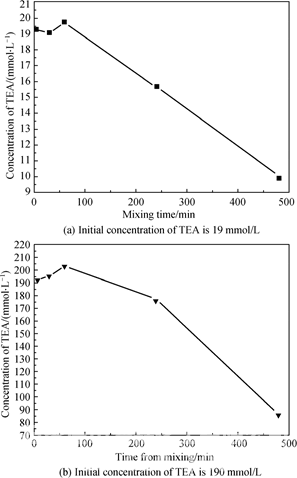 浓度的变化趋势。由图 3a 和图 3b 发现,与空白水泥相比,TEA 对溶液中的钾离子和钠离子浓度影响不大。水泥浆体溶液中的钾离子和钠离子浓度主要受溶解扩散控制,TEA 的加入对其影响很小。