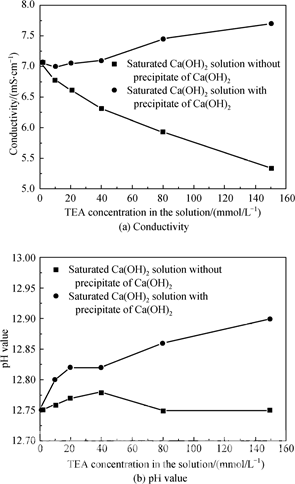 2.3 TEA 对氢氧化钙溶液电导率和 pH 的影响