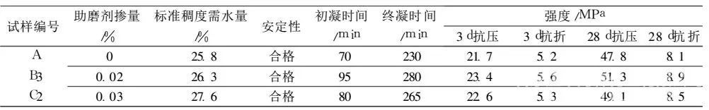 A、 B3和C2样的水泥标准稠度用水量按国标规定试验方法确定,由表3可看出:B3和 C2样的凝结时间和安定性均符合国家标准, 表明试验所掺加的三乙醇胺和乙二醇助磨剂对该性能无不利影响 。3 d,28 d的抗压和抗折强度都有提高 , B3样与 A样相比,3 d和 28 d抗压强度强度分别增加了1.7 MPa和3.5 MPa,抗折强度分别增加0.4 MPa和0.8 MPa;C2样与A样相比,3 d和28 d抗压强度分别增加了0.9 MPa和1.3 MPa,抗折强度分别增加 0.1 MPa和 0.4 MPa。笔者经过分析认为 , 造成强度提高原因可能与水泥细度提高和颗粒级配集中有关 。