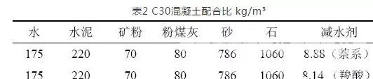 用以上两种减水剂,用相同的原材料达到相同减水率时做C30的配合比见表2。