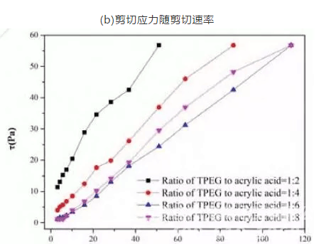 固定水灰比为0.29,分别将TPEG与丙烯酸摩尔比为1:2,1:4,1:6和1:8的聚羧酸减水剂按照0.15%(固含量)掺入水泥浆体,测定水泥浆体流变性。水泥浆体的表观黏度及剪切应力随剪切速率的变化曲线分别见图3。当TPEG与丙烯酸摩尔比为1:2时,聚羧酸减水剂表观黏度最大。这说明随着聚羧酸分子中羧基密度逐渐增大,浆体表观黏度逐渐减小,以TPEG与丙烯酸摩尔比为1:6时,水泥浆体的表观黏度最小,屈服应力最小。当TPEG与丙烯酸以摩尔比为1:6合成聚羧酸减水剂时,所合成的聚羧酸减水剂具有较好的分散性能,使得水泥浆体凝聚结构数量以及强度降低,浆体表现出较好的流变性能。