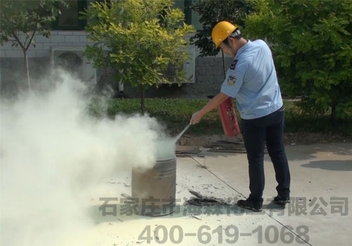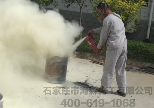 工人操作灭火器进行灭火演示