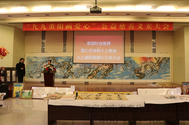 为了弘扬中华民族关爱老人的传统美德,进一步提高全民慈善理念,营造全民慈善的良好氛围。2017年10月28日,在重阳节来临之际,由河北省书画协会举办的“九九重阳画爱心”公益慈善义卖活动,将一批画师精心创作的上交书画作品经筛选后进行了慈善义卖。各行业企业家、书画爱好者参加了义卖活动,并邀请多位书画家莅临现场,此次义卖会石家庄市海森化工有限公司有幸受邀参与此次活动。