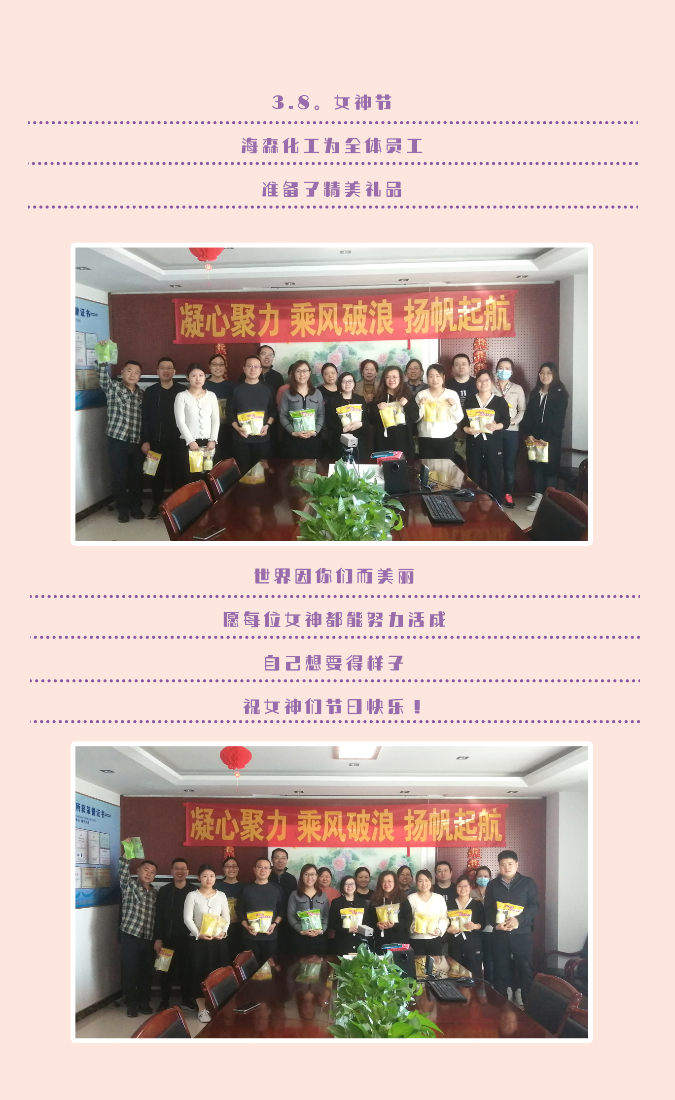 2022年3月8日,海森化工给公司全体女员工,准备精美礼品。世界因你们而美丽,海森化工愿每位女神都能努力活成自己想要的样子,祝:女神们节日快乐!幸福安康!