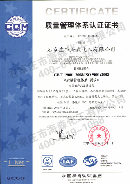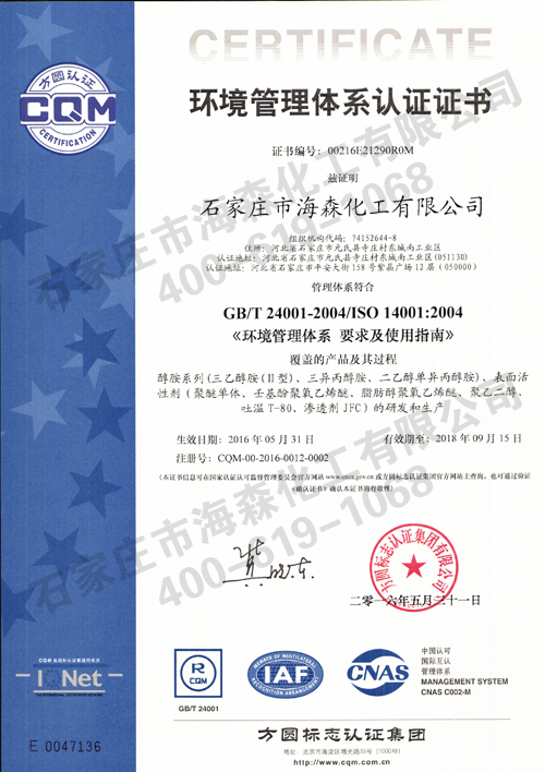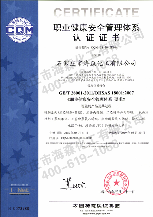 海森化工有限公司于2016年5月31日正式通过国际质量管理体系认证,并一同获OHSAS18001:2007职业健康安全管理体系认证、ISO14001:2004环境管理体系认证证书。