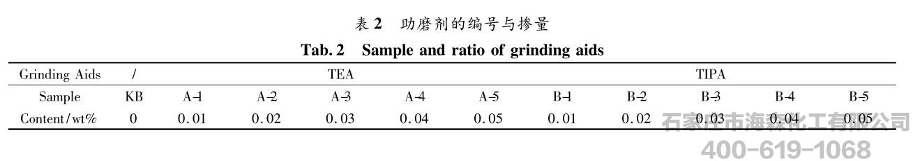 试验设定 0. 01% ~0. 05%五组助磨剂掺量及空白组,如表 2 所示。将熟料粉、矿渣、石膏按质量分数比65∶ 30∶ 5 混合均匀。助磨剂用少量去离子水稀释后,均匀点洒在粉料表面,然后倒入 500 mm ×500 mm 球磨机中粉磨 42 min,各组样品磨制过程中保持钢球级配和粉磨时间不变。