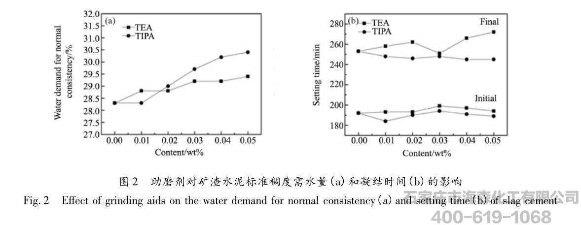 (1)TEA 和 TIPA 均能减小矿渣水泥的细度,增大比表面积,提高细颗粒的含量,增加水泥需水量,但对凝结时间的影响较小;