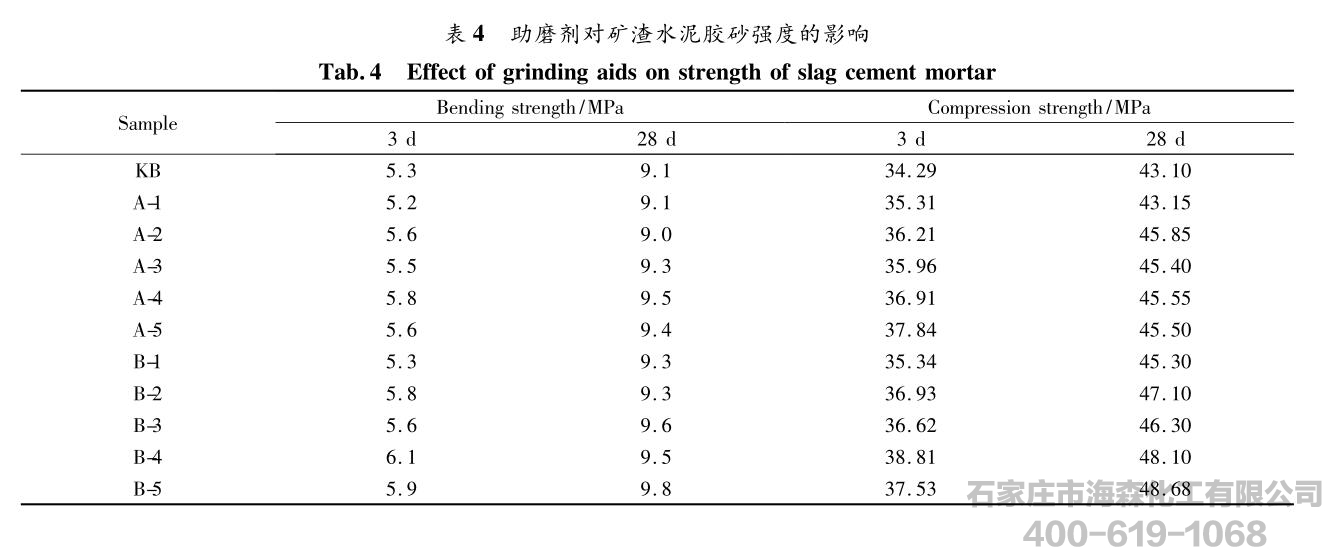 不同掺量助磨剂对矿渣水泥胶砂强度的影响见表 4。