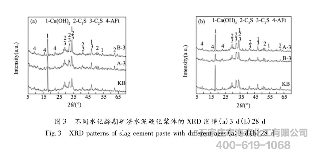 样品 A-3 和 B-3 的 Ca(OH) 2 特征峰强度(d =0. 487 nm,2θ =18. 19°)都要比 KB 样的低,这是由于液相中产生的 Ca(OH) 2 与矿渣中的活性 SiO 2 和 Al 2 O 3 发生了火山灰反应,生成水化硅酸钙和水化铝酸钙,消耗了大量的 Ca(OH) 2 ,导致矿渣水泥的水化程度提高。