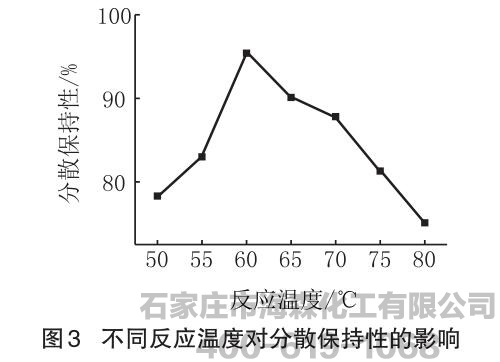 图2和图3可知,随着聚合反应温度的升高,初始水泥净浆流动度先呈现先升高后下降的态势,对水泥的分散度保持值也呈现先升高后下降的趋势。聚合反应温度较低时,水泥净浆初始流动度也较小;聚合反应温度过高时,反应容易引发爆聚现象,对水泥的分散性及分散度保持值都有较大的影响。综合