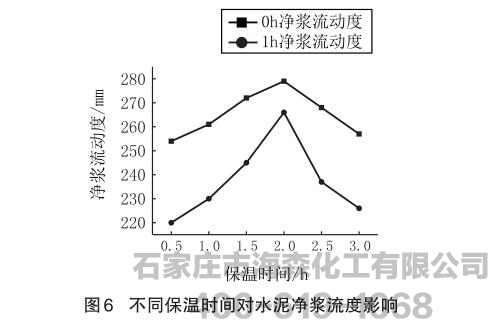 聚羧酸减水剂的水泥浆体的初始分散性和分散性保留值由图6和7可知,反应保温时间控制在2.0h。