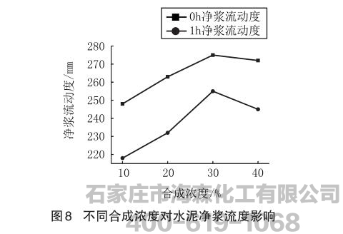 聚羧酸减水剂的分散性能。由图8和9可知,水泥净浆的分散性随着应物浓度的增加,呈先逐渐增加后下降,反应物浓度为30%时,得到的