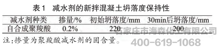 聚羧酸减水剂配制的混凝土和易性好、黏聚性好、减水率高,没有产生离析、泌水等现象。当
