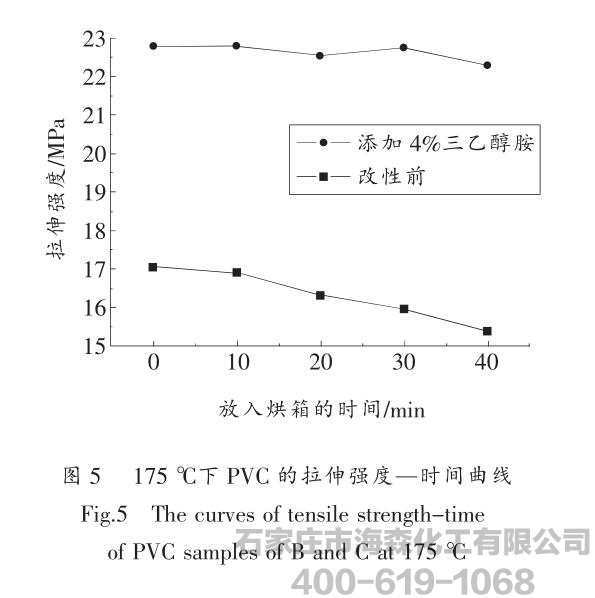 三乙醇胺改性PVC材料拉伸强度随时间变化趋势整体比较平坦。实验中材料的颜色随时间延长基本不变。说明在加工温度下,改性后的PVC比改性前的PVC热稳定性好。这可能是因为
