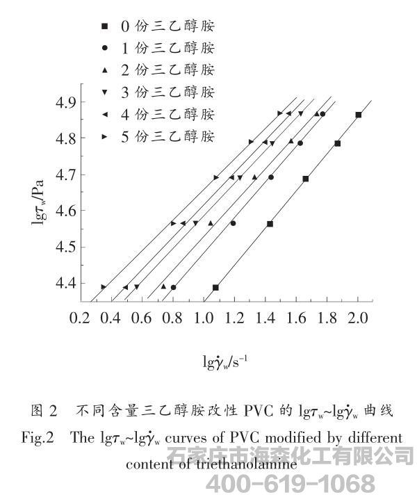 三乙醇胺改性PVC的lgτw~lgγw曲线,表明改性PVC的剪切应力与剪切速率的关联。从图2可见,经拟合后曲线呈现良好的线性关系。在实验温度下,随着剪切速率的增加,改性PVC的剪切应力也随之增加,为假塑性流体。在相同剪切速率下,其剪切应力随