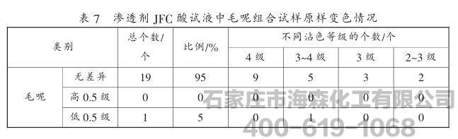 渗透剂JFC后酸试液的润湿性能。分别筛选毛呢和羊毛衫为试验对象,讨论了添加
