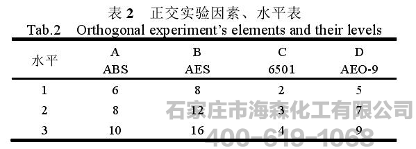 6501、D脂肪醇聚氧乙烯醚(AE0-9);每一因素取三个水平,采用四因素三水平L9(34)即9次试验的正交实验表,如表2所示。