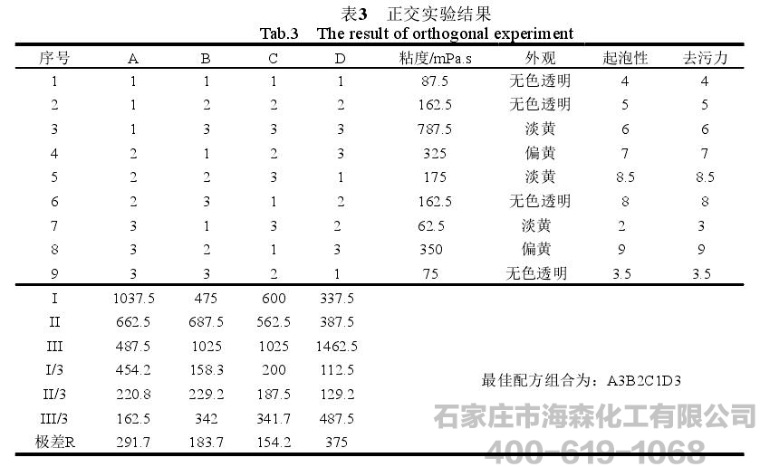 6501)对粘度影响不大。由上述粘度实验结果测定,结合起泡性和去污力实验测定,从而制定出洗洁精中这四种主要成分的最佳配方组合为:A3B2C1D3。