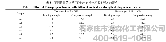 三异丙醇胺对矿渣水泥胶砂强度的影响见表3。