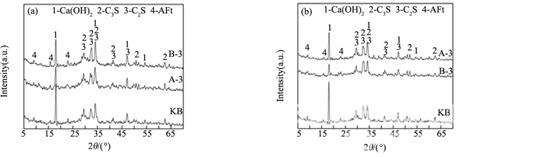 选取 KB、A-3 和 B-3 的硬化浆体,水化龄期设定为 3 d 和 28 d,分别对其进行 XRD