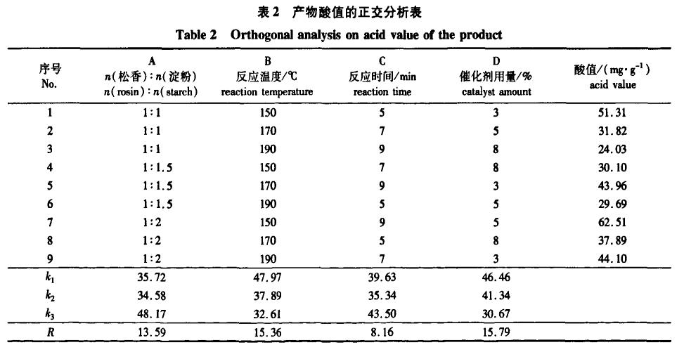 3.1.2、正交试验结果分析固定n(PEG 400):n(淀粉)3:1,常压下,正交试验的条件、产物酸值以及反应结果的极差分析见表2。