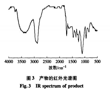 PEG400葡糖苷松香酸酯的IR分析结果见图3。在红外谱图中可清楚地看到:3340.9 am一处的强吸收峰说明结构中含有多个羟基;2874.9 cm。1为甲基和亚甲基的伸缩振动峰;1721.7和1247.9 ClTI。1处是酯基中C----O和C—m—C的特征吸收;PEG 400醚键的强吸收峰位于1105.9 cln。1处‘61;948.1 cm-1处是D一毗喃葡萄糖糖环振动的特征峰;834.1 crrl。1处为a一吡喃糖苷的特征峰;IR分析可证实PEG 400葡糖苷松香酸酯的生成。
