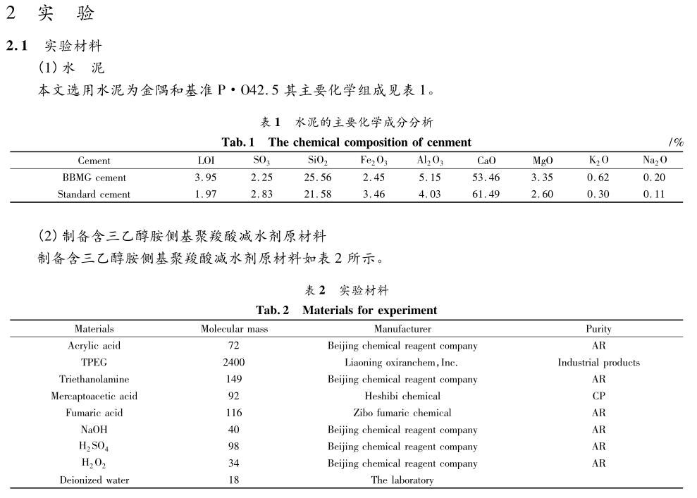 三乙醇胺与减水剂以及水泥的协同作用和适应性做过不少研究[8-10]。醇胺类物质作为水泥助磨剂的研究较多[11],但作为减水剂侧链的研究却较少。本文通过自由基共聚反应合成了一种具有