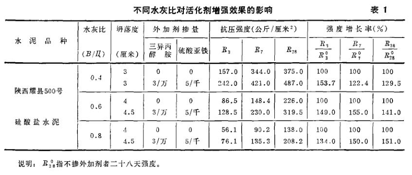 三异丙醇胺本身呈碱性,具有一定的防锈能力。为了掌握外加剂对混凝土性能的影响规律,我们对外加剂混凝土进行了以下几方面的研究:一、外加剂混凝土的抗压强度主要以三种水灰比、三种水泥、四种温度条件进行了不同龄期的强度试验。结果见表1、2、3。