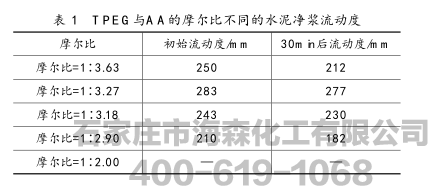减水剂的减水效果取决于其对水泥颗粒的分散性和分散稳定性,其减水率的大小受主链(疏水基)的长短,羧基和醚键等官能团的比例、分布等因素的影响,其减水性能可通过调整合成共聚物各单体的比例来获得。在引发剂用量为单体的2.0%,反应温度60±2℃、反应时间4.5h的条件下,考察TPEG和AA的比值对减水剂分散性能的影响,结果如表1。