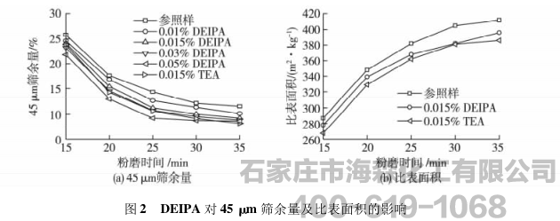 1)DEIPA有效促进了水泥粉磨过程,掺0.015%的DEIPA的水泥粉磨25min即可获得和参照样粉磨35min相近的45μm筛余量。掺入DEIPA的水泥粉磨试样的Blaine比表面积均较参照样降低,这和DEIPA改变了水泥粉体在Blaine法测定介质中的透气性有关。