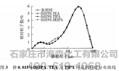 2)DEIPA在粉磨过程中的助磨特性与TEA及TIPA相似。掺入0.015%的DEIPA、TEA及TIPA均降低了小于5μm区间的微细颗粒含量,改变了水泥粉体的粒度分布,从而消除了研磨体表面的“垫层”及过粉磨现象。