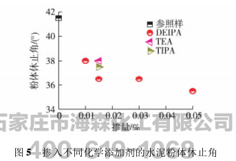DEIPA等三链烷醇胺类化学添加剂被作为助磨组分加入水泥粉磨过程中,通过平衡价键而被逐渐吸附于颗粒表面,并在水泥颗粒表面形成吸附膜。粉末颗粒之间吸附薄膜的存在,减小了水泥颗粒间的范德华力与静电引力,同时水泥颗粒间的接触面积也相对减小。这有利于粉体颗粒之间的相对滑动,从而提高粉体的流动性并降低休止角。链烷醇胺是一种极性有机物,其在水泥粉体颗粒表面的吸附是一种液固相界面间的吸附行为,吸附能力的大小与其本身的偶极距有关。