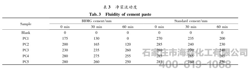 由表3可以看出PC1~5对基准水泥相容性都良好,掺有FA-TEA的PC2~5净浆流动效果优于PC1。PC1对金隅水泥的相容性较差,且净浆经时损失较大。但PC2~5对金隅水泥的相容性较好,并且且净浆经时损失较小。PC4与PC5对金隅水泥的相容性相当,即随着FA-TEA掺量的增加,减水效果达到饱和。出现这种结果的原因可能是吸附在水泥颗粒上的减水剂