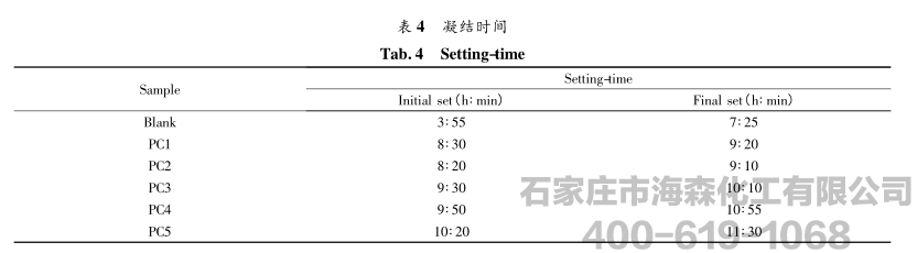 表4中与空白组相比,PC1~5都有不同程度的缓凝作用,并且随着FA-TEA掺量的提高,其初凝时间增加,缓凝作用加剧。掺加FA-TEA不影响初凝到终凝之间的时间。是因为