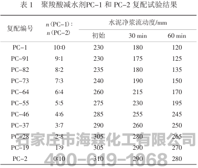 聚羧酸减水剂,并通过相互复掺技术,解决了PC-1经时损失大和PC-2价格昂贵等相关问题,从而进一步拓宽聚羧酸系减水剂的应用范围。