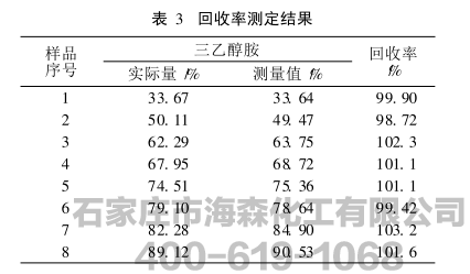 三乙醇胺试样,按选定的条件配制成试样进行色谱分析,平行实验三次,求出平均含量,测得回收率,结果见表3。