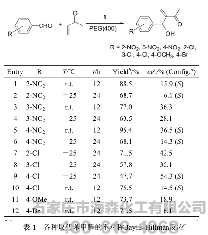 聚乙二醇(400)中催化不对称Baylis-Hillman反应,催化剂-溶剂体系可重复使用3次,反应的选择性无明显下降.