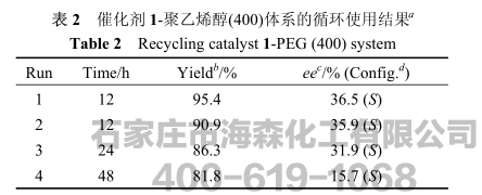 从表2的数据可以看出,对催化剂1和PEG(400)重复使用四次,反应的时间有一定的增长,反应的产率有下降,前3次1的催化立体选择性基本不变,而第4次产物的ee值有比较明显的下降.