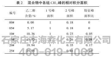 聚乙二醇分子长链的端基CH2的共振峰面积基本不变,乙二醇单体的CH2的共振峰面积相应增大。2号峰面积的增加值(即00~25#样品2号相对积分峰面积减去00#样品2号峰相对积分面积)就是乙二醇单体的CH2的共振峰相对积分面积,将此值定义为特征峰面积比。对00~25#样品的HNMR谱图两组共振峰做积分,计算出共振峰的相对积分面积比,并以此计算出混合样品中的特征峰面积,具体数值见表2。