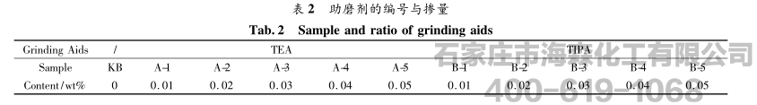 三异丙醇胺(Triisopropanolamine,TIPA)作为常用助磨剂的主要成分,具有很强的极性,能够降低水泥颗粒表面的自由能,防止颗粒团聚,增大颗粒的比表面积,还能加快熟料矿物的水化速率,因此受到国内外学者广泛关注。以往的研究主要集中于醇胺类有机物及其复合改性物对水泥的助磨效果,关于TEA和TIPA对矿渣水泥水化影响机理的研究目前还较少。为此,本实验选取TEA和TIPA作助磨剂,探讨了矿渣水泥在TEA和TIPA作用下的水化过程,为TEA和TIPA在矿渣水泥中的应用提供一定的依据。