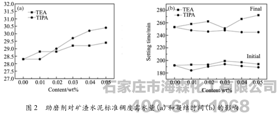 (1)TEA和TIPA均能减小矿渣水泥的细度,增大比表面积,提高细颗粒的含量,增加水泥需水量,但对凝结时间的影响较小;