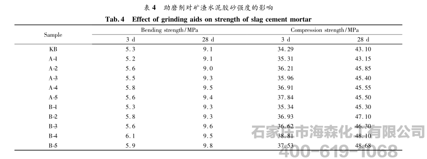 不同掺量助磨剂对矿渣水泥胶砂强度的影响见表4。