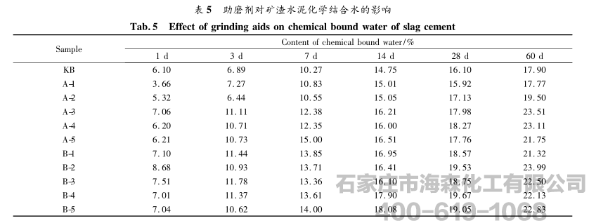 在一定温度和湿度条件下,化学结合水含量随水化产物的增多而增大,通过测定化学结合水的含量可以反映样品整体的水化程度。助磨剂对矿渣水泥不同龄期化学结合水的影响见表5。
