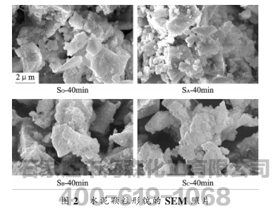 助磨剂使水泥颗粒形貌产生改变,SO中颗粒形状为不规则多边形、楔形,且棱角分明,不利于颗粒之间的流动摩擦。SA、SB和SC中颗粒的形状趋于圆弧形,边缘棱角少,更利于颗粒之间的流动和摩擦,从而促进颗粒的粉磨。