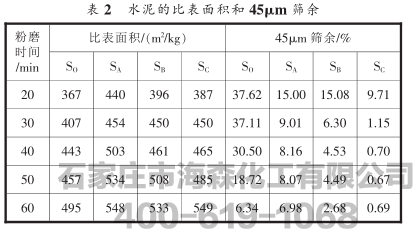 水泥颗粒的粒度分布对水泥强度影响很大,目前国内外研究结果为:3~32μm颗粒对强度增长起主要作用,其粒度分布应是连续的,且总量不低于65%;小于3μm的细颗粒易结团,其含量不要超过10%;大于60μm的颗粒对强度基本不起作用,只能作为填充材料,最好没有。因此,助磨剂在粉磨中能否对水泥粒度分布产生有利影响,是其助磨作用的重要指标。