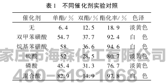 由表中结果可知,采用混合酸作催化剂,其产品收率高,质量好。而且催化剂加入量以物料0.1%为最佳。催化剂加入过多则成本上升。