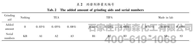 三异丙醇胺,添加量分别分别为0.03%,0.05%,0.08%,试验编号对应为B1,B2,B3;第四组添加实验室自制助磨剂,添加量分别为0.03%,0.05%,0.08%,试验编号对应为S1,S2,S3。具体如表2所示。