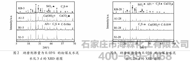 目前市售液体助磨剂掺量都在水泥质量的0.05%左右,考虑到实验组0.03%的掺量效果与0.05%的掺量效果相差不大,而在成本上却可减少40%,因此决定选用A1,B1,S1组作为XRD和SEM研究对象。